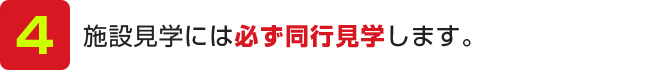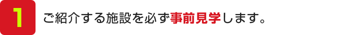 当センターの介護アドバイザーが事前に施設を見学し、施設の方へヒアリングを行います。当センターがしっかりと施設の運営方針、特徴等を理解し雰囲気を直接感じることで、正確な情報をお伝えします。
